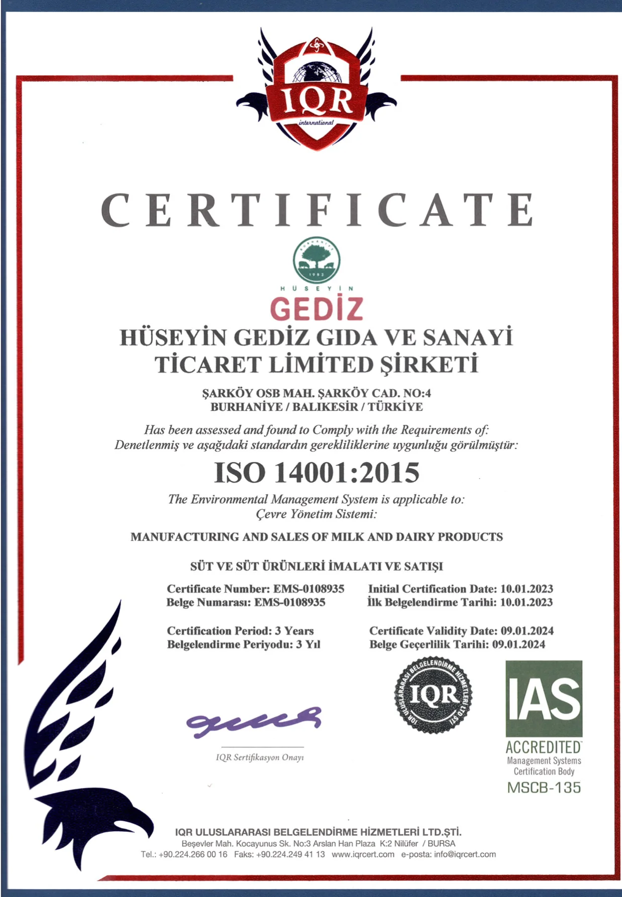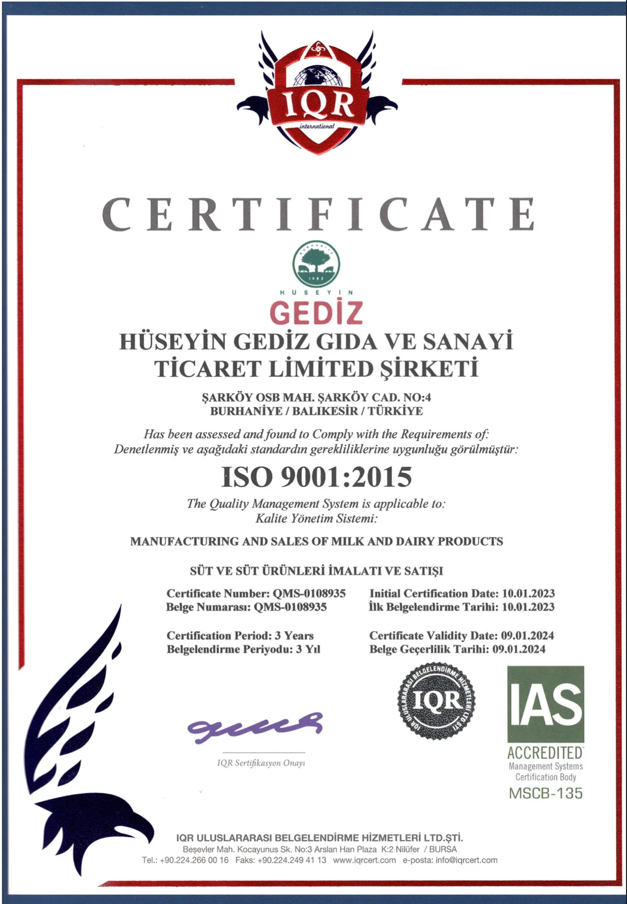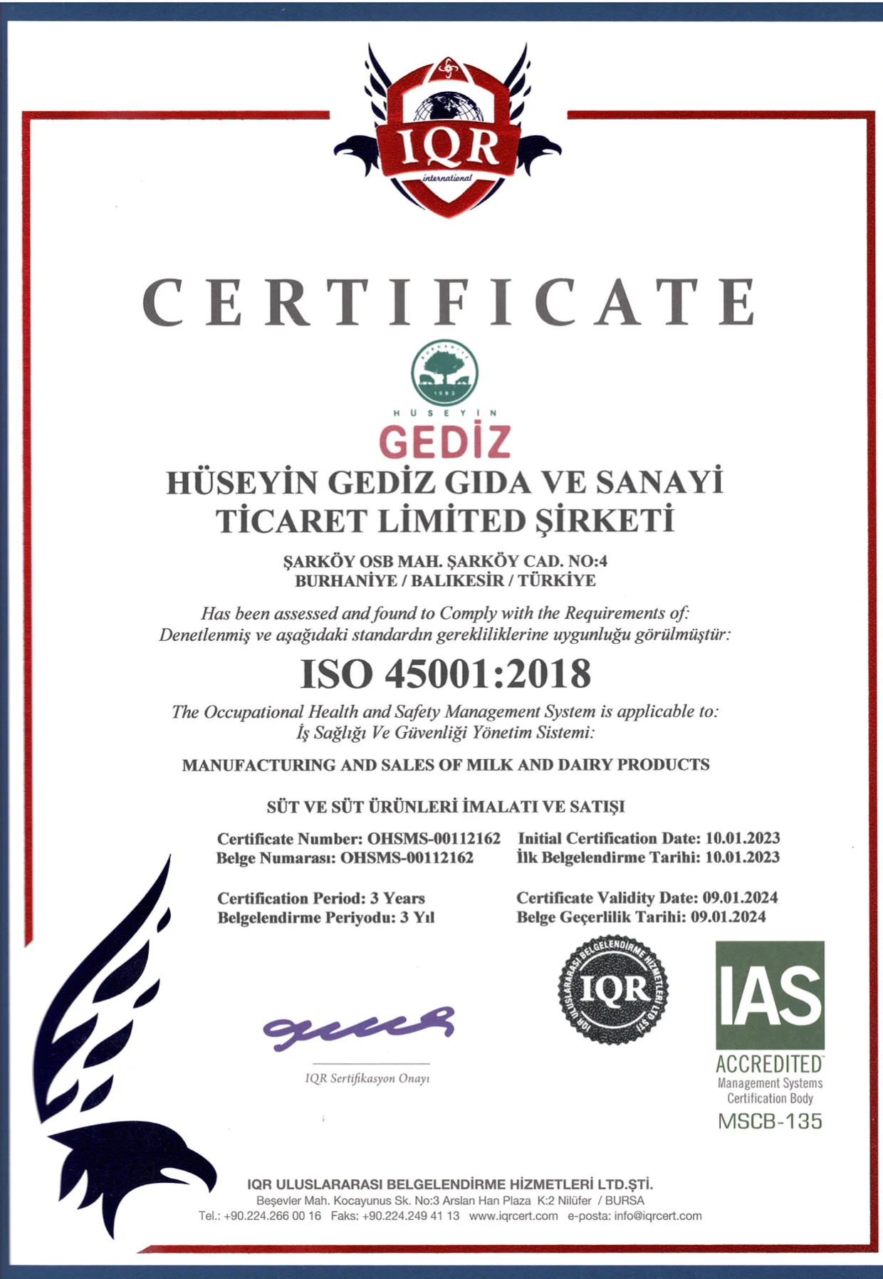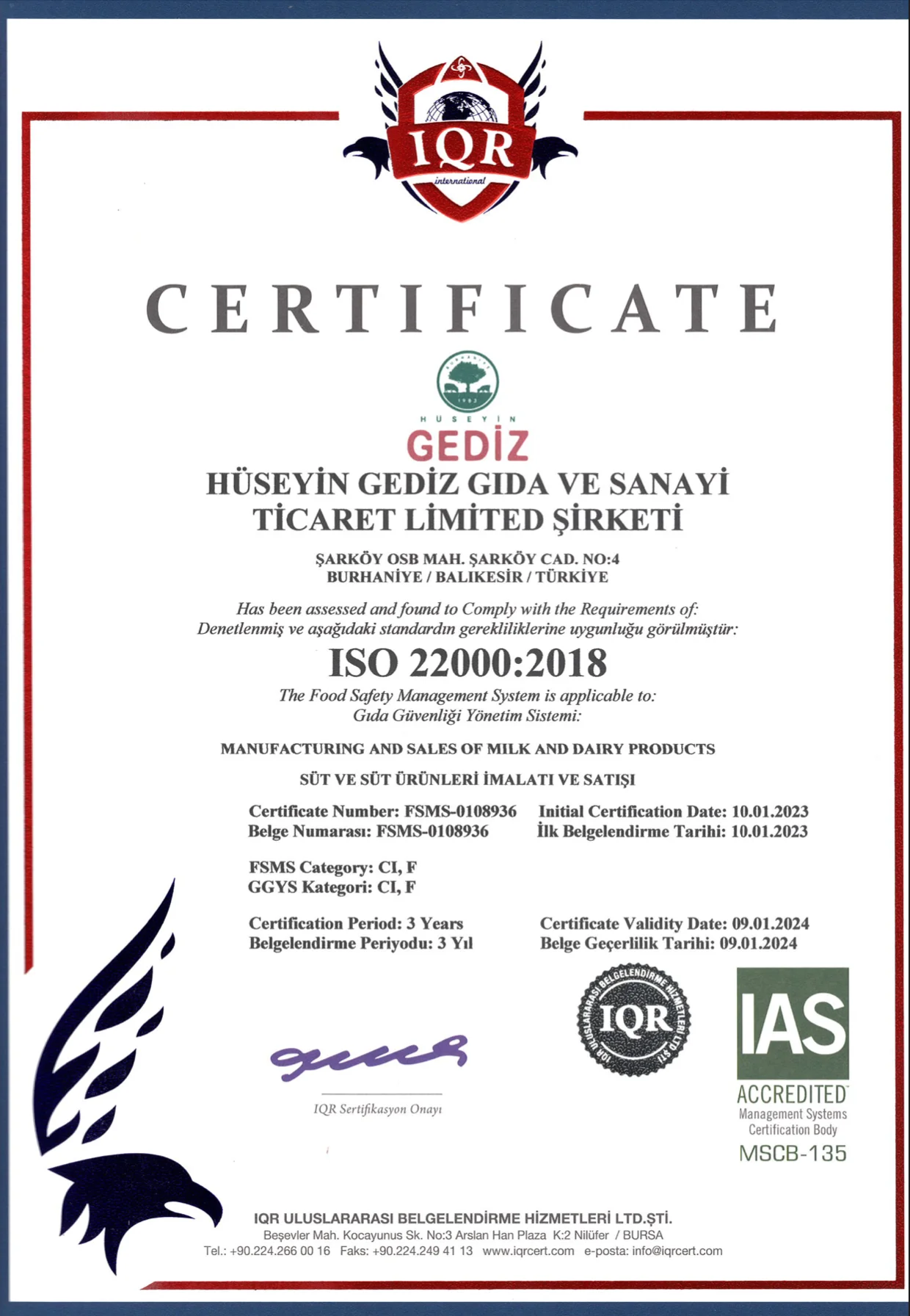 Sürekli gelişen üretim teknolojilerini nesilden nesile aktarılan tecrübemiz ve eğitimlerimizle birleştirerek yeni üretim tesisimizi; gelişen ve değişen dünya standartları doğrultusunda ve gıda güvenliği kapsamında ISO 22000:2018, ISO 9001:2015; ISO 14001:2015 ve ISO 45001:2018 şartlarına uygun hale getirerek belgelendirdik.